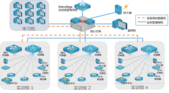 每个实训室配备IPv6防火墙、IPv6路由器、IPv6交换机、IPv6无线产品以及IPv6云服务实训平台,给予IPv6方面的从网络到系统应用的实训实操。