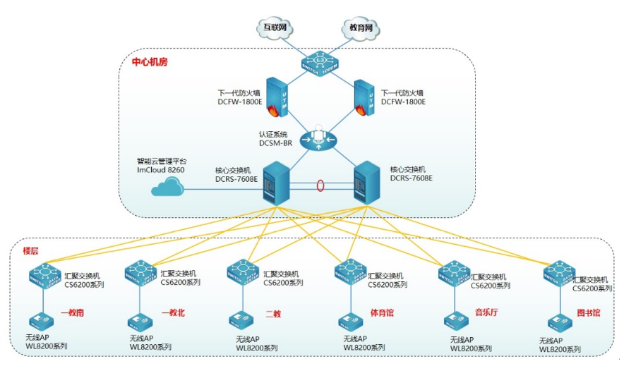为方便用户对无线管理和维护,提升用户无线体验,使无线更智能化,此次采用南宫NG28官网智能云管理平台ImCloud 8260实现无线统一的管理、维护、认证,并可实现对全网无线设备管理、实现易部署、易维护、易扩展的无线网络。南宫NG28官网云管理ImCloud方案是网络服务的新模式,基于云端实现网络服务和管理,将复杂的网络管理简单化、智能化、可视化,提升用户网络体验。同时为了保证无线的安全,无线采用Portal准入认证,云管理ImCloud南宫NG28官网身份认证系统DCSM-BR实现联动,用户需要顺利获得账号和密码认证成功后才能接入无线网络,在保证无线连接的便捷性同时兼顾无线的安全性。