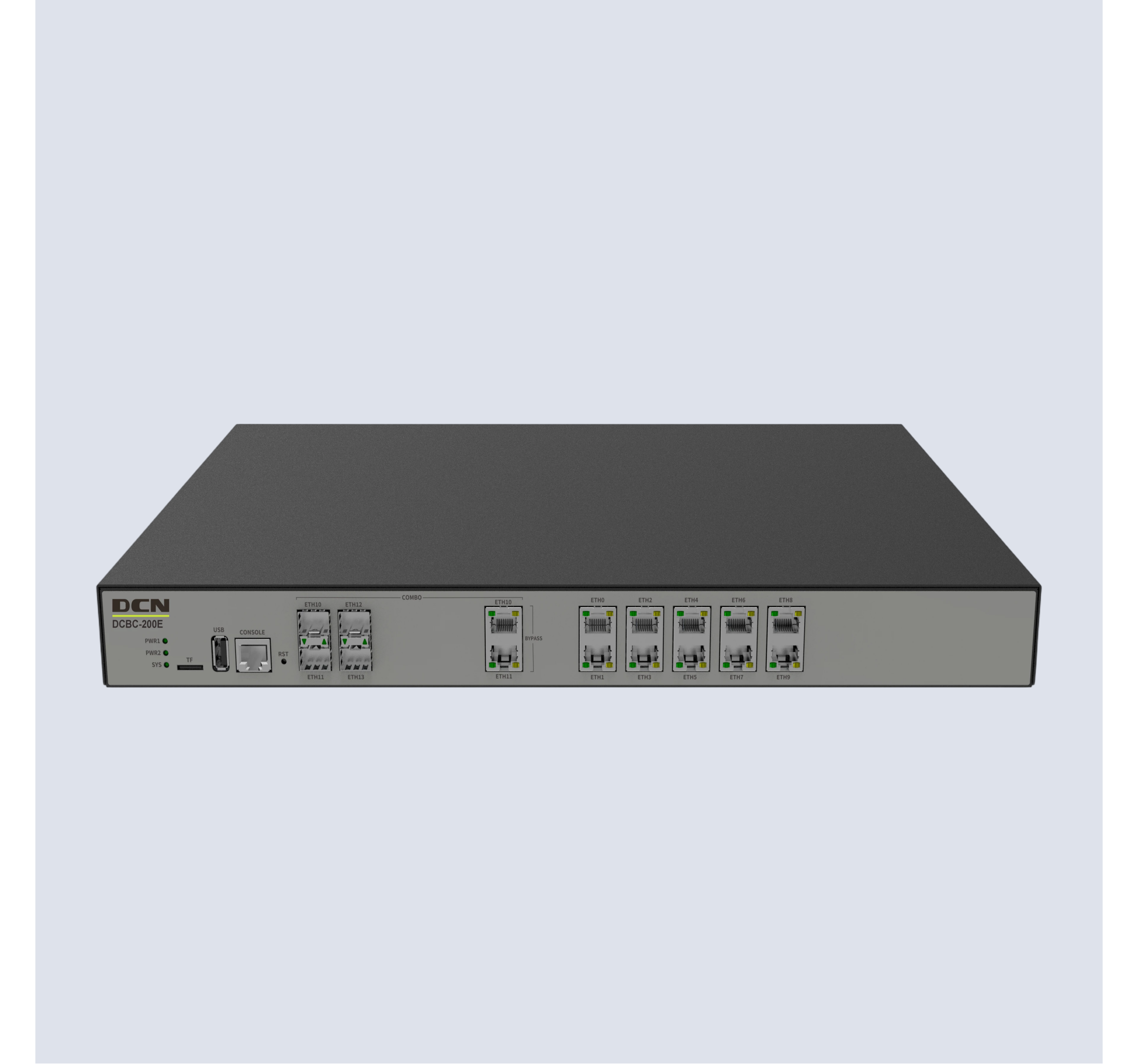 DCBC-200E 10个千兆电接口,2个千兆光接口,2个千兆Combo接口(光电复用),2扩,1U高度,19寸机箱,标配512G SSD硬盘,1组bypass,标配双电源,200M审计带宽;